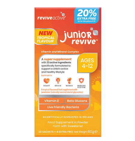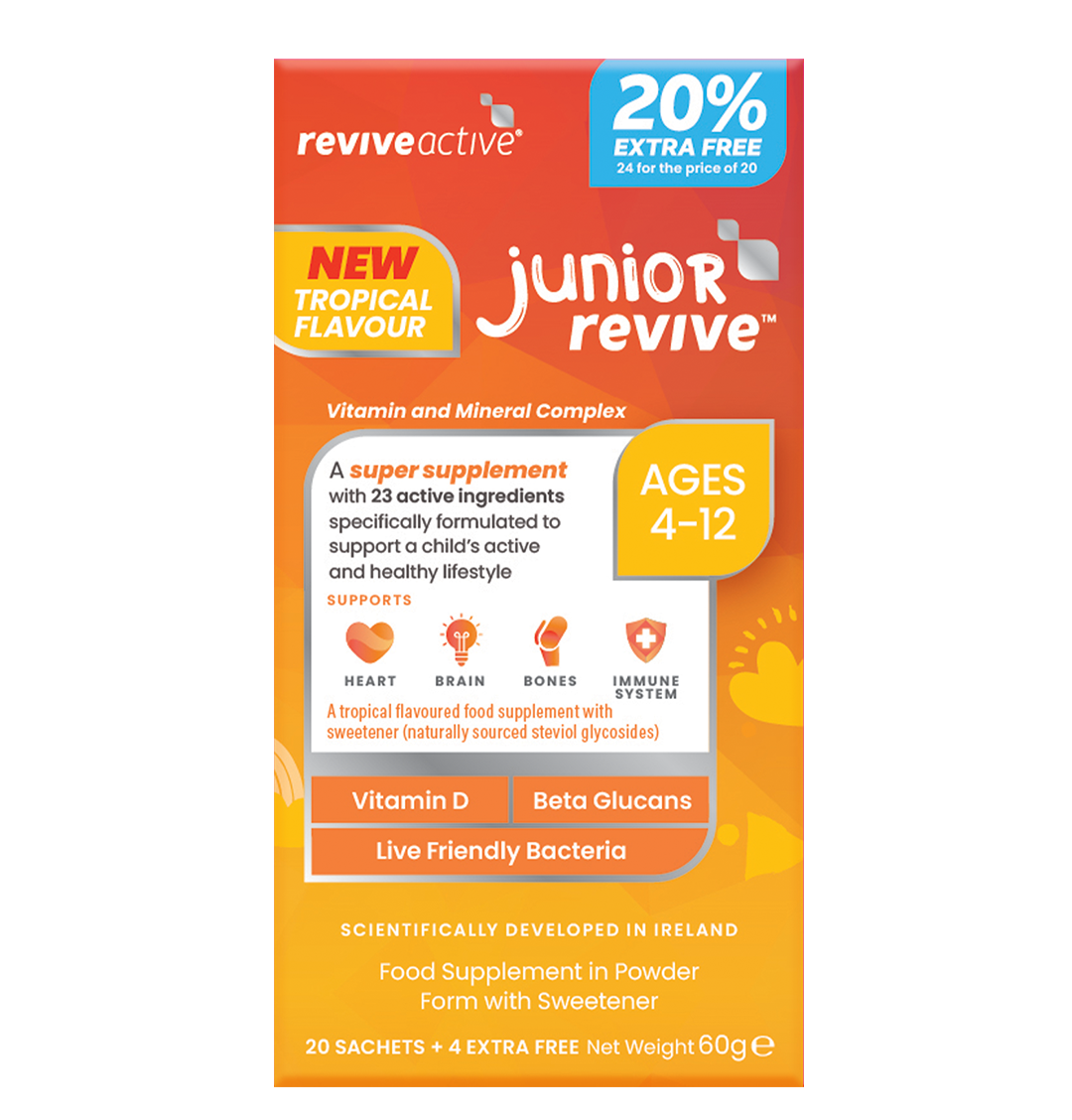 Junior Revive is a tropical flavoured super supplement with 23 Active ingredients including 13 vitamins, 6 minerals, 4 fruit & vegetable powders, Beta Glucans, Fibre, live friendly bacteria and Choline to support a child’s immunity, energy and mental performance all in one daily sachet.