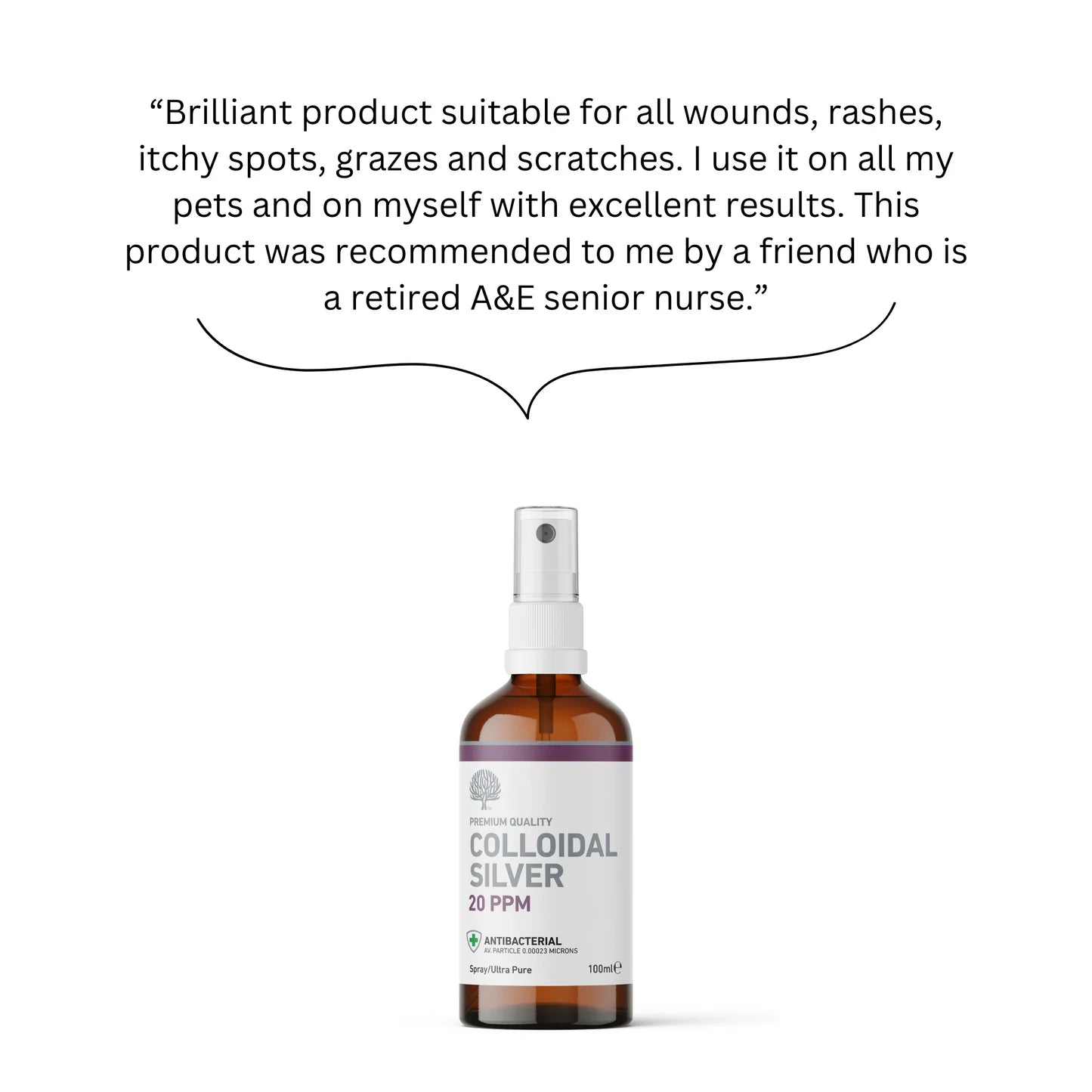 A 20ppm colloidal silver spray in a protective amber glass bottle, designed to support clean, balanced skin. Ideal for daily skincare or for use on areas prone to blemishes, irritation, or surface imbalance.
