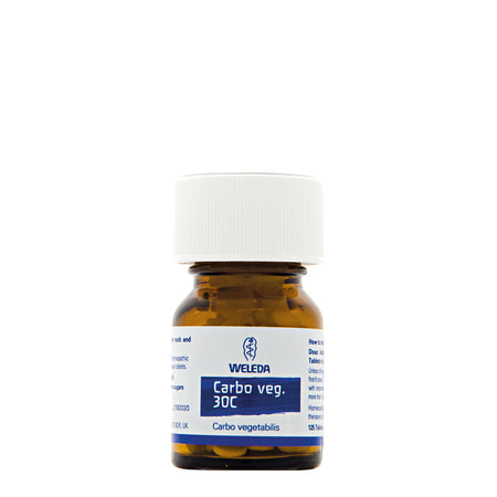 Contains Carbo vegetabilis 30C homeopathic potency on 100mg lactose/sucrose tablets.