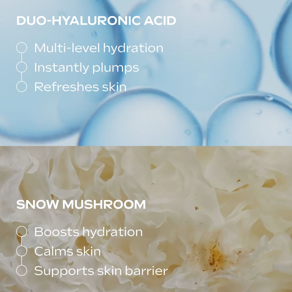 Quench your skin with nature's deepest hydration. This lightweight, fast-absorbing serum delivers both immediate and long-lasting hydration, helping to plump the skin, smooth fine lines, and restore a fresh, dewy glow. Snow mushroom, celebrated for its ability to hold up to 500 times its weight in water, works in harmony with skin-identical hyaluronic acid to support the skin barrier and lock in moisture. Use daily on its own or mix with your moisturiser for skin that feels soft, supple, and radiant.